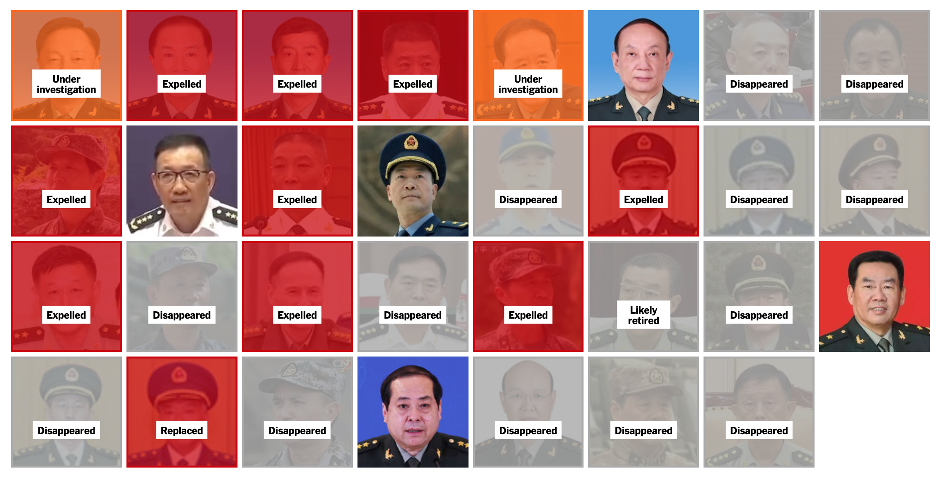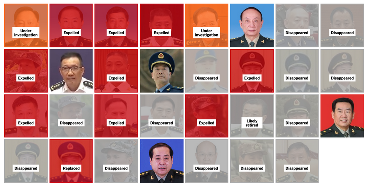 Dall'inizio del 2023, su 30 alti generali e ammiragli, solo sette hanno mantenuto le loro posizioni, mentre gli altri sono stati mandati in pensione o sono di fatto «scomparsi» dalla scena pubblica, ha calcolato The New York Times sulla base di notizie dei media statali cinesi e dichiarazioni ufficiali. L'ultimo episodio è stato l'apertura di indagini contro il primo vicepresidente di Xi Jinping nella Commissione Militare Centrale, Zhang Youxia, e il capo dello stato maggiore congiunto della commissione, il generale Liu Zhenli, ufficialmente sospettati di «gravi violazioni della disciplina e della legge».